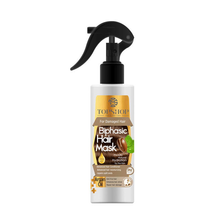 اسپری مو دوفاز تاپ شاپ حاوی روغن گیاهی آرگان است که موهای آسیب دیده با رنگ و ابزار حرارتی را ترمیم می کند و با رطوبت رسانی و ترمیم موها می تواند زندگی دوباره را به موهای شما بازگرداند . روغن آرگان که در این محصول نیز بکار رفته است؛ یک درمان کننده ی طبیعی برای مو است و باعث رشد سریع مو شده و همچنین با تغذیه ریشه ی مو ها باعث تقویت پیاز مو و جلوگیری از ریزش و رشد موهای ریز می شود. ویتامین E داخل روغن آرگان برای مو بسیار مفید است و به عنوان یک آنتی اکسیدان برای تقویت و رشد مجدد مو تاثیر شگرفی دارد. همچنین می توان تاثیر روغن آرگان را به عنوان یک مرطوب کننده روی پوست سر برای مبارزه با خشکی پوست و شوره مشاهده کرد. استفاده از اسپری مو دوفاز تاپ شاپ حاوی روغن آرگان ؛باعث تامین آب و مواد مغذی مو و سلامت آن می گردد و در نتیجه موجب جلوگیری از ایجاد موخوره و دوشاخه شدن مو می شود. این ماسک مو با تغذیه ی مو به وسیله روغن آرگان، تعادل بار الکتریکی در موهای آسیب دیده شما ایجاد می نماید و حالت پروازی و نامناسبی که هنگام شانه کردن مو به دلیل انباشت بار الکتریکی منفی وجود دارد را خنثی می کند. این ماسک مو با ایجاد غشای سیلیکونی روی ساقه مو و بستن پولک های مو، حجم بیشتر و ظاهری ابریشمی و درخشان به ساقه موها می بخشد و باعث شلاقی شدن مو بدون سنگین شدن آنها می شود. دایمتیکون(سیکلو پنتا سیلوکسان) مورد استفاده در این ماسک مو با ایجاد روکش نازک غیر چرب بر سطح تار مو موجب تثبیت رنگ مو، کاهش حالت استاتیک مو (الکتریسیته ساکن) و بهبود شانه پذیری مو می گردد؛ همچنین با بستن پولک های کوتیکول مو به آنها ظاهر صاف و براق تری می بخشد و موجب افزایش مقاومت مو در برابر آسیب های ناخواسته خارجی می شود. این اسپری موی دو فاز به عنوان یک لایه محافظتی پیش از استفاده از اتو مو یا سشوار گرم، بسیار مناسب است. این ماسک مو برای انواع مو به ویژه موهای خشک و آسیب پذیر مناسب می باشد همچنین افرادی که موهای آن ها دارای آسیب کمتری می باشد نیز پیشنهاد می شود زیرا از آسیب دیدگی موها و دهیدراته شدن ساقه موها پیشگیری می کند. این محصول نیاز به آبکشی ندارد و برای استفاده در خارج از حمام تعبیه شده است.