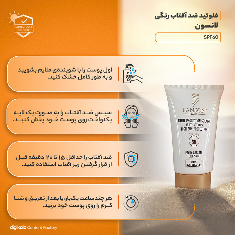 فلوئید ضد آفتاب رنگی لانسون مدل SPF60 شماره 1.5 محافظ UVA ،UVB، مناسب پوست چرب حجم 40 میلیلیتر