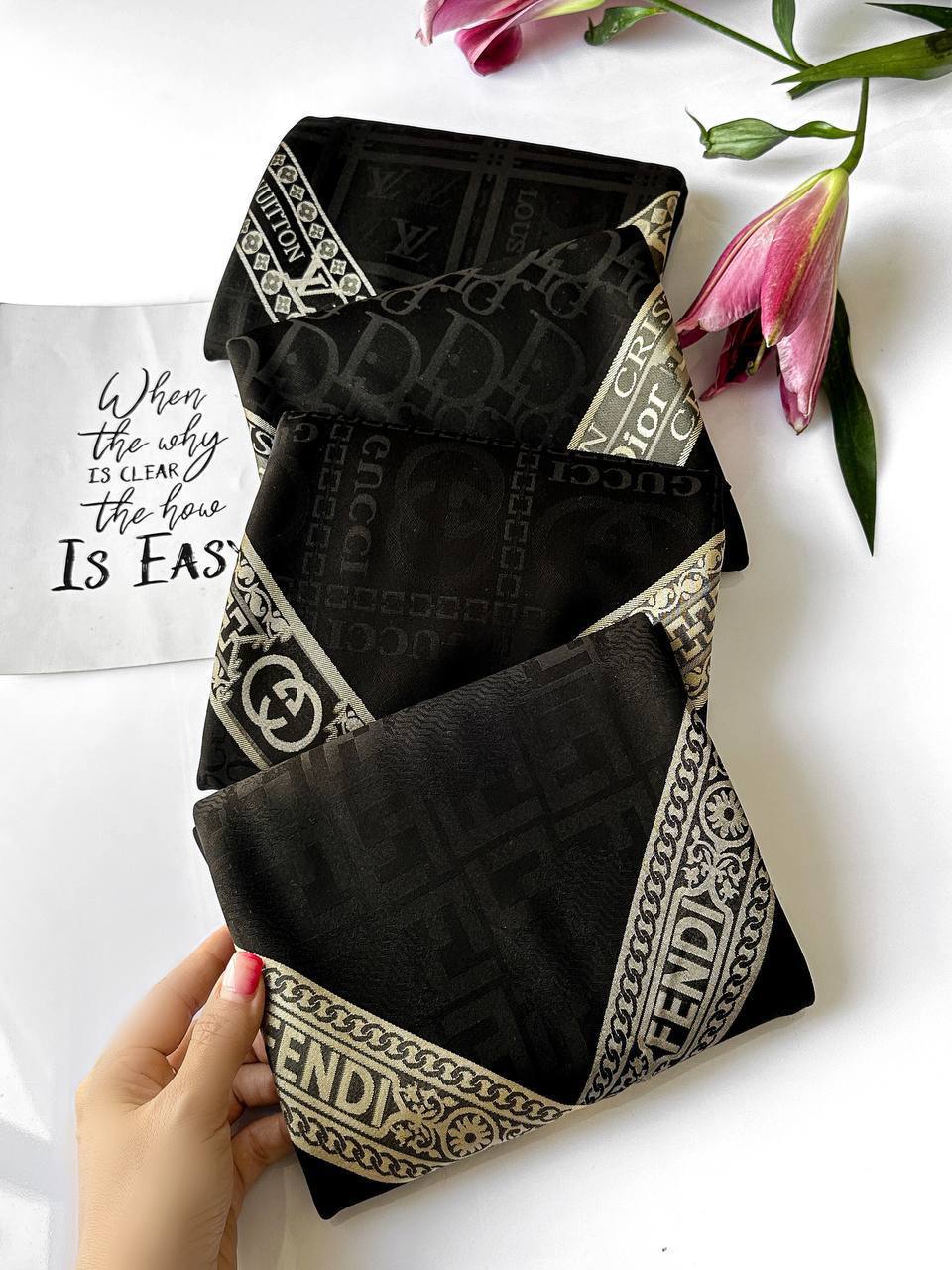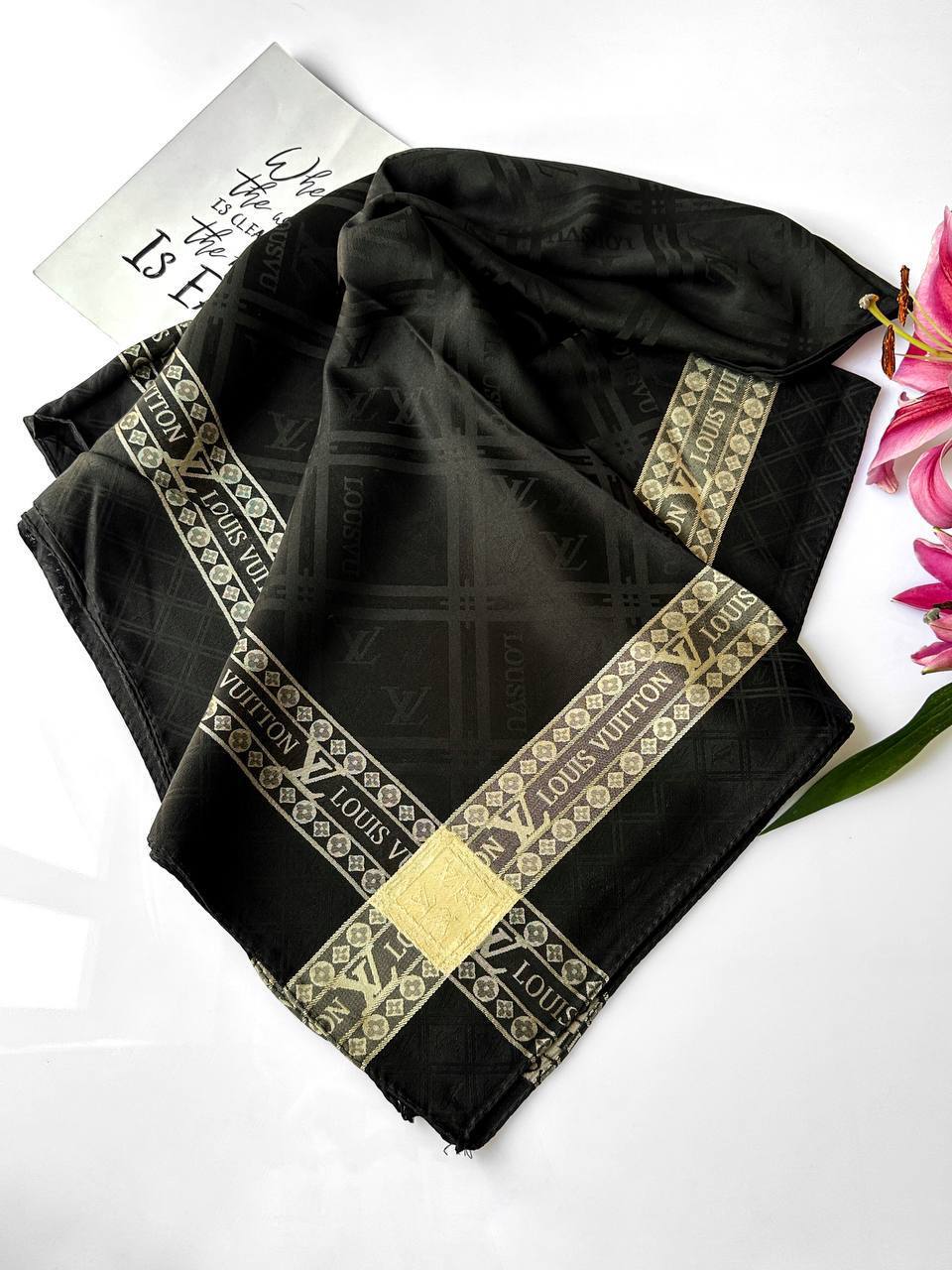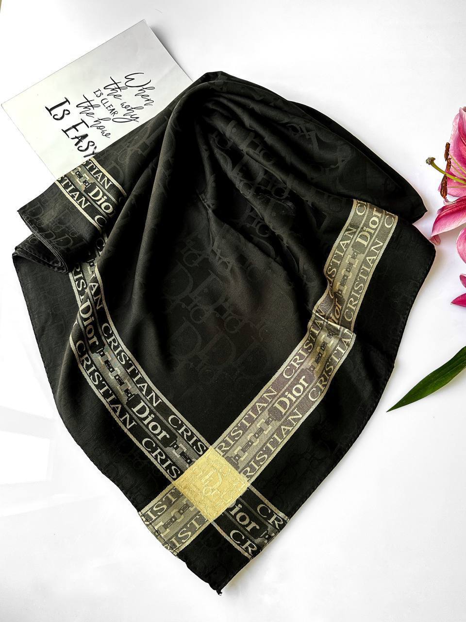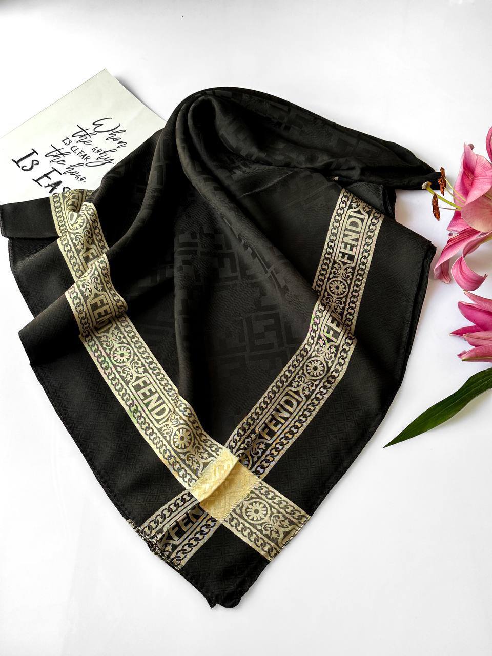🌱روسری ابریشم ژاکارد مشکی طلایی🌱 🦋 قواره: ۱۳۰
